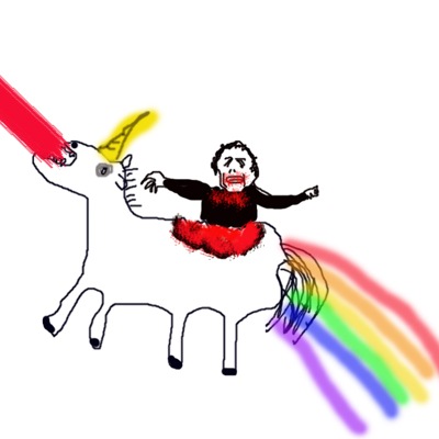 Artists rendering of  the unreleased final scene from Apocalypse Now where a Zombie Marlon Brando eats a unicorn who simultaneously pukes out blood and shits rainbows.
